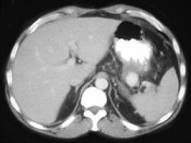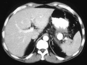 - 单项选择题男,36岁, 反复剑突下胀痛5年,加重伴间断性呕血、黑便3年, 有6年慢性胰腺炎病史,CT检查如图, 最可能的诊断是 ( )