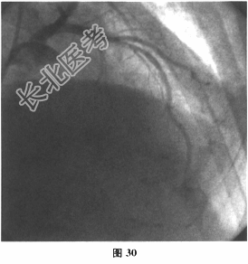 - 多项选择题4.[提示]心梗后第7天股动脉路径行CAG/PCI术,术中见mLAD90%狭窄伴钙化(图30), pRCA25%狭窄,mRCA50%狭窄, PDA50%狭窄。于mLAD处植入支架于mLAD病变处,残余狭窄25%, TIMI血流3级。手术结束后,返回病房上床时突然出现意识丧失, 呼之不应。
