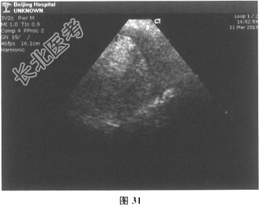 - 多项选择题6.[提示]床旁超声心动图(图31)示大量心包积液,可疑左室室间隔近心尖部破裂。因情况危急, 立即转运至导管室,行左室造影证实为左室室间隔近心尖部破裂。