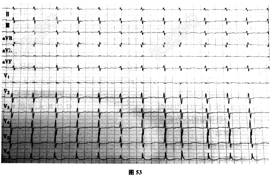 - 多项选择题2.[提示]实验室检查:血BNP362.8pg/ml; WBC10.32×109/L,N87.2%, L12.1%;HbA1c8.4%; TC6.18mmol/L,TG1.45mmol/L, HDL-C0.83mmol/L,LDL-C4.53mmol/L, Tn-I0.01ng/ml。心电图:心房颤动, V2~V5导联ST段压低<0.05mV,无动态变化(图53)。超声心动图: LA37mm×40mm×55mm,LV舒张末/收缩末内径53/42mm, 室间隔和左室后壁对称肥厚13mrn,前壁近心尖部心肌变薄, 运动及增厚率消失,二尖瓣、三尖瓣轻度反流, E/A<1,LVEF52%。胸部X线片: 双肺纹理增粗,心影不大。