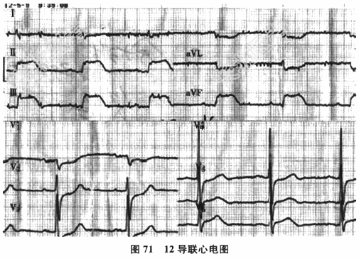 - [材料题] 患者男性,82岁,因"间断心悸、气促3年余,加重1个月,突发上腹痛3小时"入院。3年前患者无明显诱因反复出现心悸、气促,持续数十分钟至数小时,曾就诊于社区医院,行心电图检查提示"心房颤动",静脉予胺碘酮后转复。此后,患者仍间断有上述症状,每年1~2次,发作时自行口服胺碘酮200mg后,约数小时症状可逐渐缓解。近1个月,患者夜间频发上述症状,共3次,均服用胺碘酮后逐渐缓解。入院前12小时,患者于夜间排尿后再次发作心悸、气促,伴轻微头晕,自服胺碘酮200mg未能缓解,加服倍他乐克12.5mg后逐渐缓解。入院前3小时,患者再次发作心悸、气促,伴持续性剧烈上腹部疼痛,无放射痛,无其他伴随症状,呼叫120急救中心送至医院。既往史:否认高血压、糖尿病、高脂血症病史。否认吸烟史。无早发冠心病家族史。查体:T36.6℃,P57次/分,R24次/分,BP120/80mmHg。颈静脉无怒张,双肺呼吸音粗,双下肺未闻及湿啰音。心界不大,心律齐,未闻及杂音。腹平软,无压痛、反跳痛及肌紧张,未闻及腹部血管杂音,双下肢无水肿。血常规:白细胞12.18×109/L,中性粒细胞0.93,血红蛋白128.2g/L,血小板149×109/L。电解质:K+3.9mmol/L,Na+140.1mmol/L,Cl-106.8mmol/L。凝血功能:D-Dimer238g/L,INR1.09。蛋白C活性73.3%,蛋白S活性108.0%。心肌损伤标志物:CK-MB23.9g/L,MYO453.30g/L,TNI11.74g/L。超声心动图:左房前后径3.0cm,左心室舒张末期内径5.0cm,室间隔厚度1.0cm,低左心室射血分数64%,左心室下壁基底段运动异常。常规12导联心电图如图71所示。