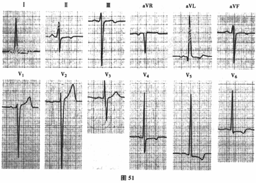 - 多项选择题2.[提示]ECG如图51所示。实验室检查:血气分析大致正常。cTnI及心肌酶正常。超声心动图: 主动脉瓣瓣叶增厚、回声增强,瓣叶收缩期开放幅度减小。主动脉瓣收缩期最大血流速度6m/s, 平均压力阶差70mmHg,瓣口面积0.7cm2, 主动脉瓣舒张期可见少至中量反流。左室、左房扩大,左室射血分数(LVEF)59%。胸部X线片: 双肺纹理粗乱。