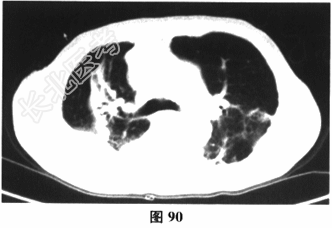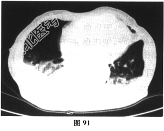 - 多项选择题3.[提示]动脉血气分析:pH7.32, PCO280mmHg,PO250mmHg, SaO285%,HCO-334mmol/L。胸部HRCT结果如图90和图91所示。