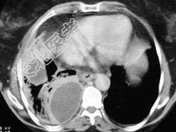 - 单项选择题男,54岁, 发热、胸痛一月余,继往有酗酒史, 请结合CT图像选择最可能的诊断 ( )