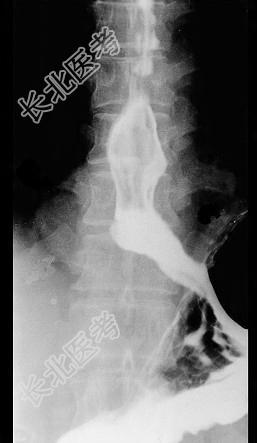 - 单项选择题男性患者,42岁, 2年前始有吞咽梗阻感,近期又出现胸骨后压迫感, 入院行X线钡餐检查,结果如图所示, 最有可能的诊断是 ( )