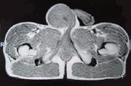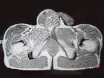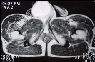 - 单项选择题29岁男性患者,右侧睾丸肿痛5个多月, 行MRI检查,如图所示, T1加权见右侧阴囊内见球形肿块,呈中等信号, 其内信号不均,T2加权肿块为高信号, 最可能的结果是 ( )