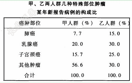 - 单项选择题某年,甲、乙两人群,几种特殊部位的肿瘤新报告病例的构成比如下表: