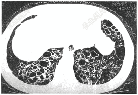- 单项选择题患者男,70岁,因反复咳嗽、咳脓痰20余年,活动后气促3年,加重3天入院。入院体查:双下肺可闻及散在湿性啰音,有杵状指。肺部HRCT如下图,考虑诊断为( )