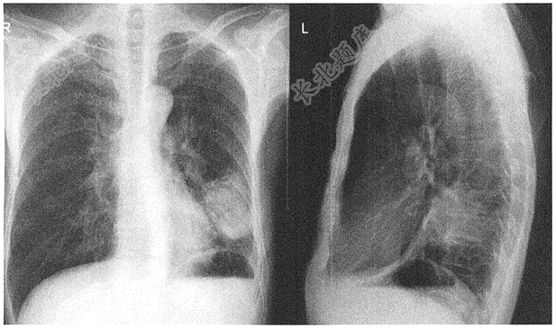 - 单项选择题中年男性患者,因咳嗽、咳痰、痰中带血一周入院,既往体健,有30余年吸烟史,吸烟≥400支/年。入院体查:左侧锁骨上可扪及肿大淋巴结,左下肺呼吸音稍低,无啰音。胸片如下图,请结合临床考虑患者最可能诊断是( )