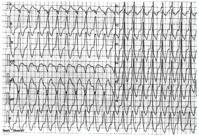 - 单项选择题患者男性,45岁,心悸伴头晕2天,至门诊行心电图检查,心电图如下,请给予诊断( )