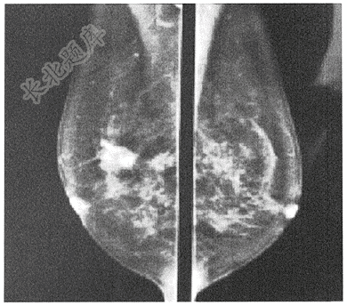- 单项选择题老年女性,55岁,因发现右乳肿物周入院。患者右乳外上象限可见2×3cm肿物,质硬,固定,局部皮肤可见皱缩,行钼钯如下图,最有可能的诊断是( )