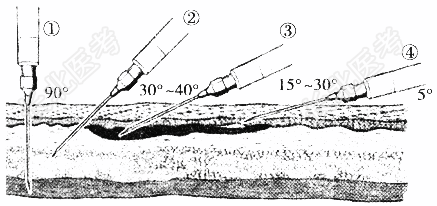 - 单项选择题皮下注射的进针角度(如图所示)为