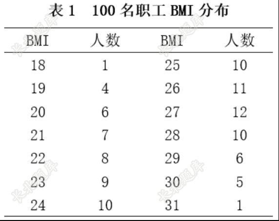 - 单项选择题2021-某健康体检机构于2017年对某单位100名职工进行健康,体检,该单位负责人想获得本单位职工的主要健康问题及主要行为危险因素,根据体检结果,该单位100名职工的BMI结果如下: (BMI, 人数) (18, 1) (19, 4) (20, 6, ) (21, 7) (22, 8) (23, 9) (24,10) (25,10) (26, 11, ) (27, 12) (28, 10) (29, 6) (30, 5) (31, 1)。使用BMI结果,根据我国成人体重判定标准,该单位职工肥胖者所占比例是