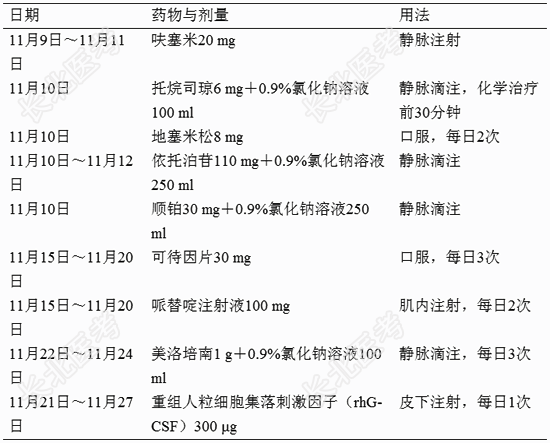 - [材料题] 患者男性,55岁,身高153cm,体重60kg,体表面积1.53m2,因“咳嗽、胸闷伴面部肿胀2个月”入院。既往体健,有青霉素过敏史。查体:一般情况评分(KPS)70分,右锁骨上可及2cm×2cm包块,质硬,无压痛,双肺呼吸音粗,右下肺呼吸音减低。实验室检查:血常规、尿常规、凝血常规、及血生化均正常。CA125糖蛋白89.46kU/L。免疫组化示PCK阳性,CK7阳性,CgA阳性,Syn阳性,CD56阳性。影像学检查:胸部CT示右肺上叶中央型肺癌伴阻塞性肺炎,远端节段性肺不张,纵隔淋巴结转移,右侧胸腔积液,右上肺肺大泡。腹部+盆腔增强CT示双侧胸腔积液伴右下肺膨胀不全,肝、脾、胰及双肾未见明显异常。诊断:右肺小细胞肺癌局限期。患者化学治疗后5日出现胸部疼痛,评分为5分,给予镇痛治疗。化学治疗后10日出现乏力,口腔溃疡,发热38.5℃,咳嗽,少量白色黏痰,左下肺可闻及少量湿啰音。实验室检查:血常规示白细胞0.6×109/L,中性粒细胞0.05×109/L,血红蛋白106/L,血小板144×109/L。给予抗感染治疗后好转。用药医嘱如下表。
