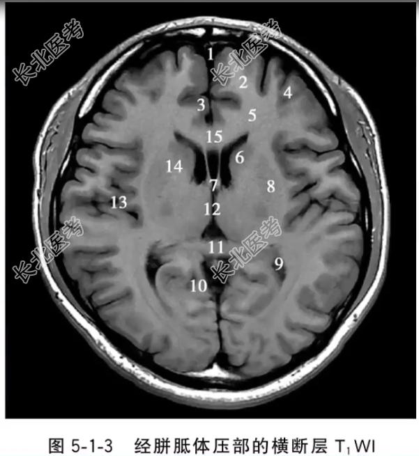 - 单项选择题经胼胝体压部的横断层T1WI中,标记为8的结构是