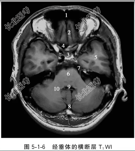 - 单项选择题经垂体的横断层T1WI中,标记为3的结构是