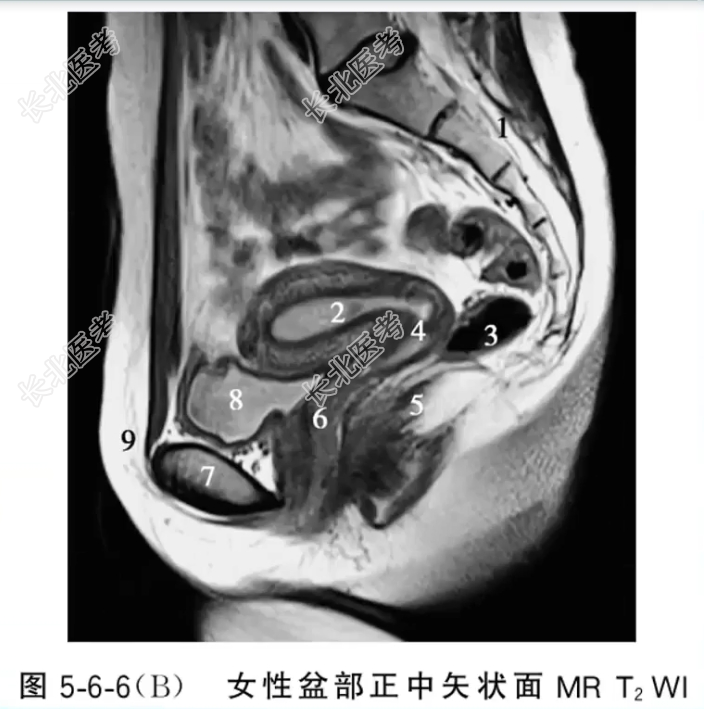 - 单项选择题女性盆部正中矢状面MRT2WI图像中,标记为2、4、6的结构分别是