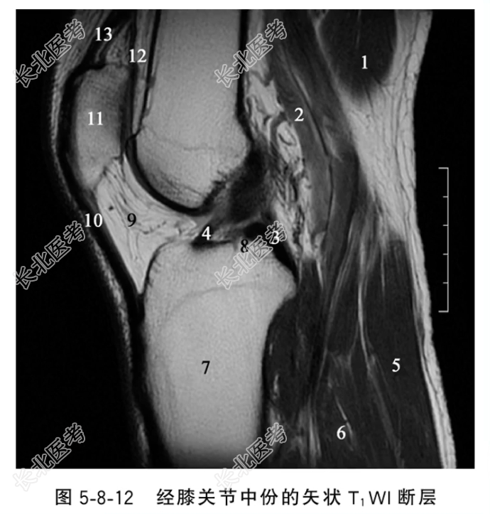 - 单项选择题在经膝关节中份的矢状T,WI断层图像中,标注3、4、12的结构分别是
