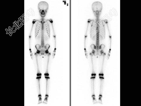 - 全身骨静态显像显示骨骼系统多发异常放射性