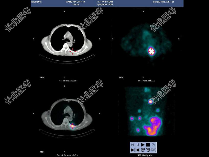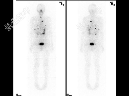 - 多项选择题63岁男性患者,甲状腺滤泡状癌术后3年, 行131I全身显像及SPECT/CT图像融合如图,正确的诊断是 ( )