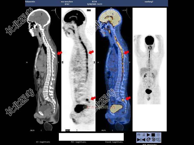 - 多项选择题男,32岁, 确诊左颞叶胶质母细胞瘤Ⅳ级,手术切除病灶, 术后放疗2个月,化疗3个疗程; 现距放疗结束17个月。查体:右上肢轻度乏力, 骶尾部及双足麻木,排便困难; 检查:MRI示左颞叶肿瘤局部复发可能。行PET/CT显像全身检查如图。最可能的诊断是 ( )