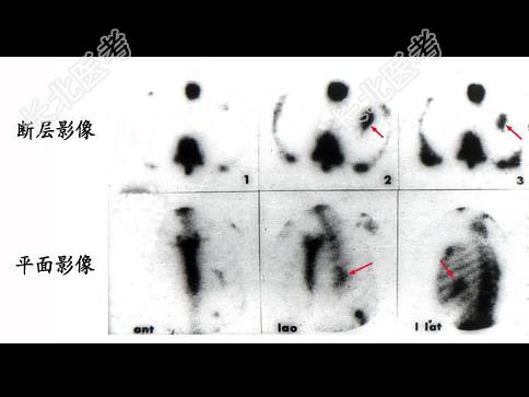 - 单项选择题某患者突发心前区压榨痛2小时,行99Tcm-PYP显像如图, 正确的描述是 ( )