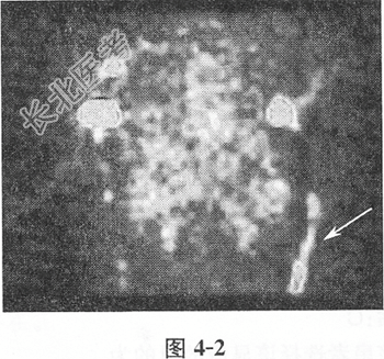 [材料题] 乳腺癌患者经手术后出现了患侧上肢肿胀,进行99mTc-植酸钠上肢淋巴显像后如图42所示: