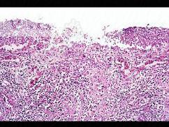 C、整个肠粘膜有假膜覆盖,粘膜上皮及腺体大片消失
