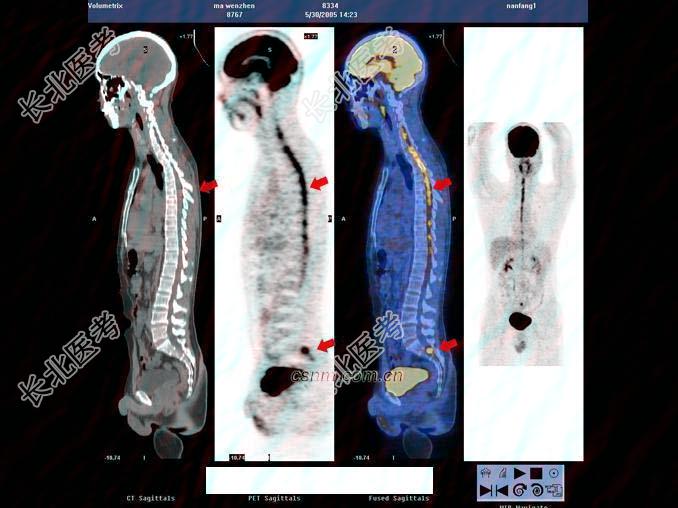 多项选择题男,32岁, 确诊左颞叶胶质母细胞瘤Ⅳ级,手术切除病灶, 术后放疗2个月,化疗3个疗程; 现距放疗结束17个月。查体:右上肢轻度乏力, 骶尾部及双足麻木,排便困难; 检查:MRI示左颞叶肿瘤局部复发可能。行PET/CT显像全身检查如图。最可能的诊断 ( )