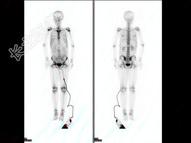- 多项选择题男,21岁, 临床诊断胃癌,诉全身多处骨关节疼痛, 行全身骨显像如图,对此影像下列描述正确的是 ( )