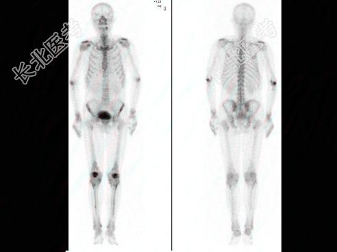 - 多项选择题男,69岁, 肺癌化疗中,诉下肢疼痛3个月, 行全身骨显像如图,可能的诊断 ( )