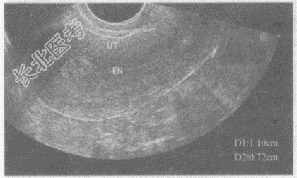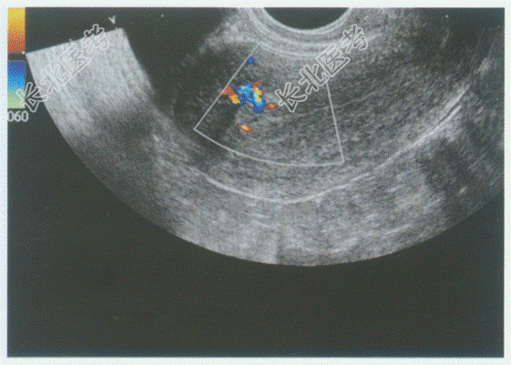 超声综合描述:子宫形态饱满, 宫腔内见1.1cm×0.8cm中强回声区,边界不清晰, 内回声不均,CDFI: 内可见血流信号。见下图及彩图。