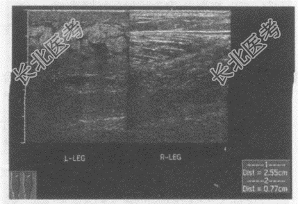 超声综合描述:左下肢扫查皮下组织层结构紊乱, 回声不均,明显增厚, 厚度2.55cm(右下肢相对应部位皮下组织层厚度0.77cm)。