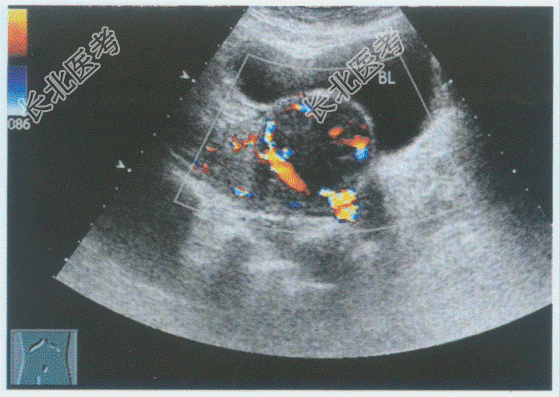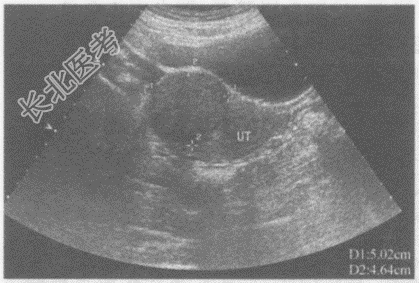 - 单项选择题临床资料:女性, 40岁,常规体检。超声综合描述: 子宫前位,宫底右前壁可见5.0cm×4.6cm稍低回声区, 边界清晰,形态规则, 内回声尚均匀,向包膜外突起, CDFI:稍低回声区内及周边可见丰富动静脉血流信号。见下图及彩图。其超声提示: