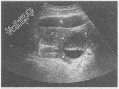 超声综合描述: 左附件区可见圆形无回声区(箭头所示),边界清晰, 形态规则,上半部透声不清亮, 下半部透声清亮,两层间有一平面, 随体位移动而变化。
