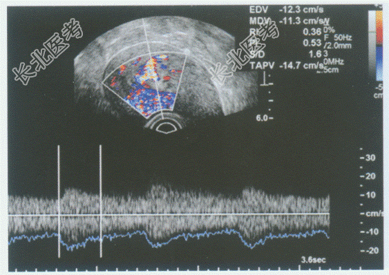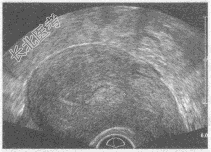 - 单项选择题临床资料:女性患者, 22岁,自述月经量增多淋漓不止。超声综合描述: 经阴道扫查子宫前位,形态大小正常, 肌层回声均匀,宫腔内可见1.7cm×0.7cm中等回声区(+…+所指), 宫腔线连续中断,CDFI: 可见彩色血流自蒂部伸入其内。见下图及彩图。超声提示:
