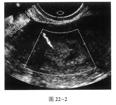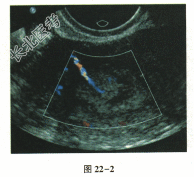 - 单项选择题患者女,36岁, 不规则阴道流血半年余,其子宫超声声像图如图22-1, 图22-2。最可能的诊断是