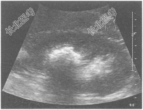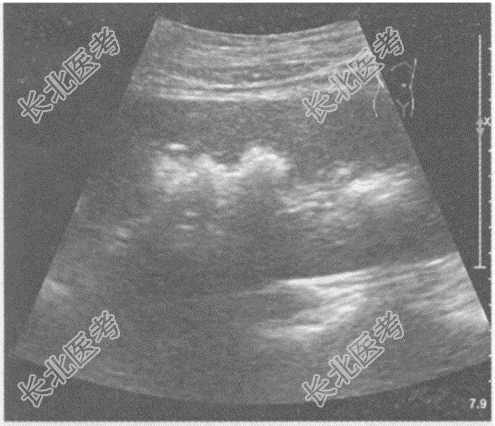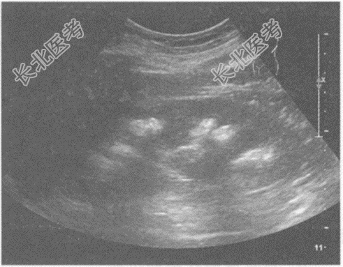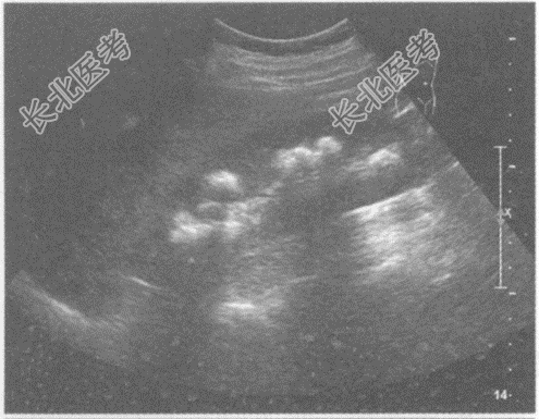 超声综合描述: 双肾形态、大小正常,沿肾锥体分布可见多个强回声光团, 后伴声影。