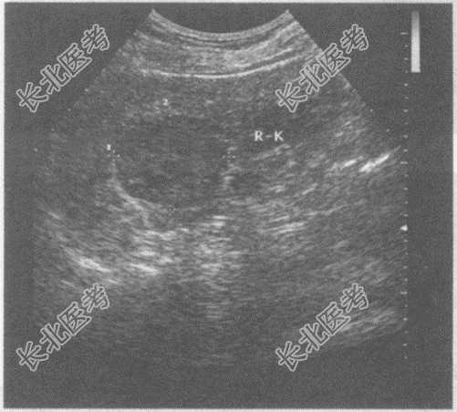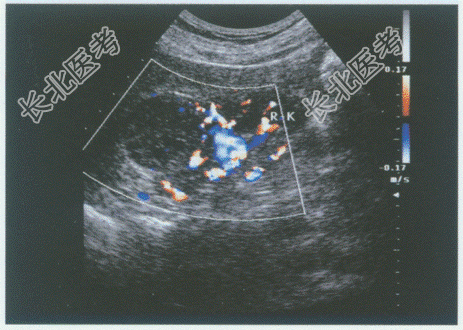 超声综合描述:右肾上极可见4.3cm×3.7cm低回声区, 边界清晰,形态规则, 向包膜外突起,CDFI: 低回声区周边可见丰富动静脉血流信号。见下图及彩图。