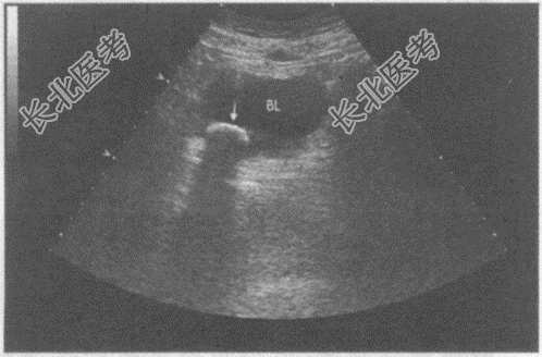 超声综合描述:膀胱充盈好, 腔内可见2.1cm弧形强回声光带,后伴声影, 可随体位变化而移动(箭头所示)。