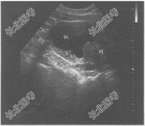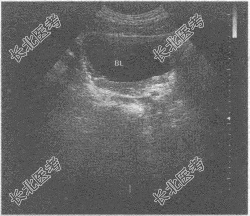 超声综合描述:横切4: 00~8:00处可见扁平形中等回声区, 表面粗糙,内回声不均, 最大厚度1.1cm,后方无声影, 体位变动形态无改变。