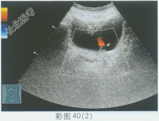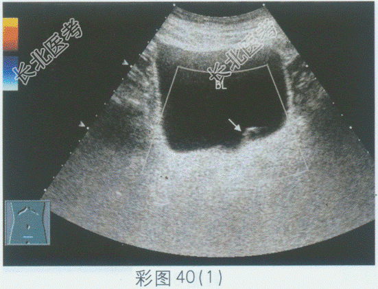 超声综合描述: 膀胱三角区左输尿管开口处可见直径1.2cm圆形无回声区,无回声区与左输尿管相通, 动态观察随输尿管蠕动无回声有节律性变化。见彩图40。