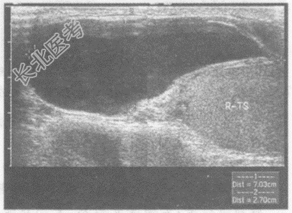 超声综合描述: 右侧睾丸形态、大小正常,内回声均匀。右睾丸头侧可见无回声区, 内透声欠清亮,与腹腔不相通。