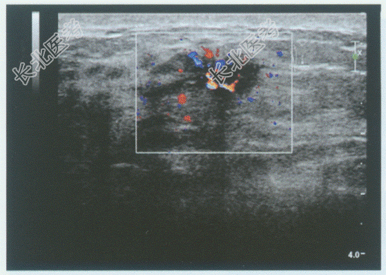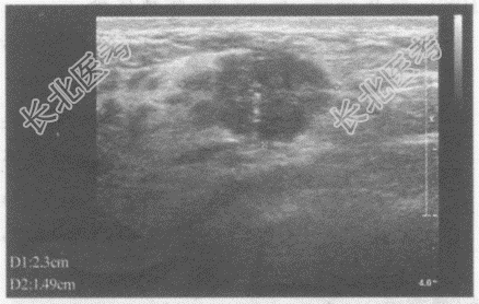 超声综合描述: 右乳外上象限可见2.0cm×1.5cm低回声区,形态欠规则, 边界不平呈锯齿状,内回声不均, 可见点状强回声,CDFI: 内可见较丰富点棒状动静脉血流信号,V
