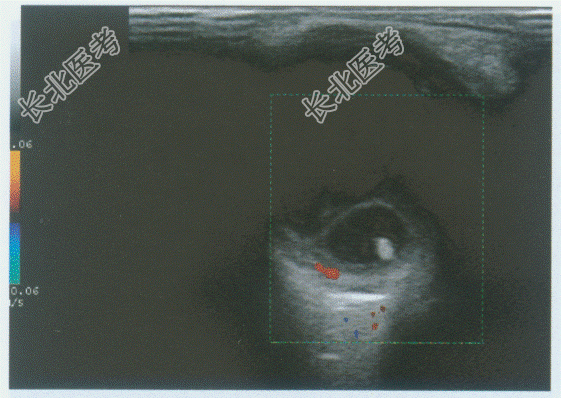 - 单项选择题男性,8岁, 自述左眼视物不清。超声综合描述:左眼玻璃体暗区透声不清亮, 后极部可见椭圆形中强回声光环,内见点状强回声。见下彩图。超声提示: