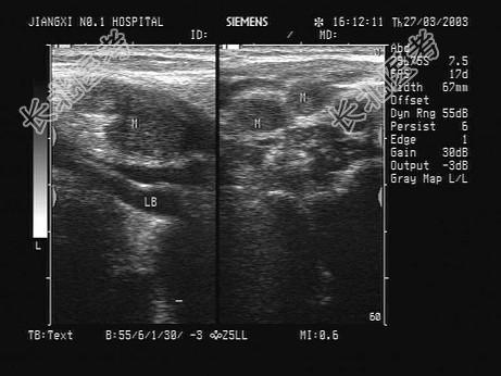 - 单项选择题患者发现颈部肿块两年余,没有明显不适。甲状腺超声显示甲状腺及血管旁异常光团, 如图。最可能的诊断为 ( )