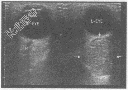 - 单项选择题临床资料:男, 49岁,自述左眼胀不适6个月, 进行性眼球向外突出,视力下降。超声综合描述: 左眼球后可见5.1cm×4.6cm圆形中等回声区(箭头所示),边界清晰, 内回声不均,探头轻压前后径稍小, 视神经被挤向鼻侧,CDFI: 内未见明显动静脉血流信号。超声提示: