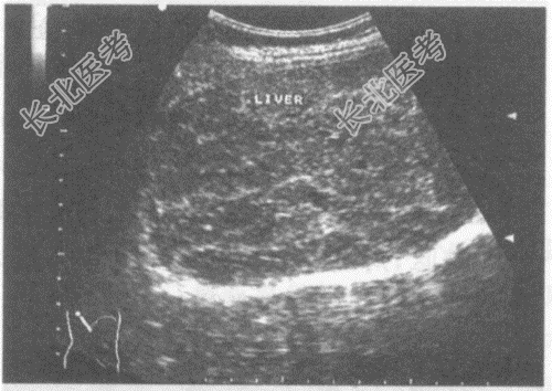 超声综合描述: 肝回声明显不均,全肝布满结节, 呈龟背样改变。