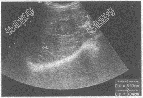 超声综合描述:肝表面不平, 肝回声不均,肝中裂增宽, 三支肝静脉变细,门静脉内径1.4cm, 左叶可见3.4cm×3.0cm中等回声区,周边有晕, CDFI:中等回声周边可见血管绕行。见下图及彩图。