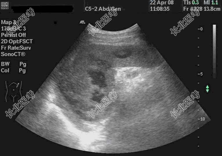 - 单项选择题患者男,77岁, 由于“间断发热半月余,加重伴胸闷1天”来诊, 曾间断使用头孢三代、喹诺酮类等抗炎及退热药物治疗,未见明显好转。入院体格检查: 体温39.1℃,脉搏88次/分, 呼吸22次/分,双肺听诊: 呼吸音减低,未闻及干湿啰音, 脾肋下未及,肝肾区无叩痛, 上腹正中有压痛。辅助检查:血常规WBC 21.2×109/L, N 85.6%,L6.9%; 超声检查如图,应诊断为